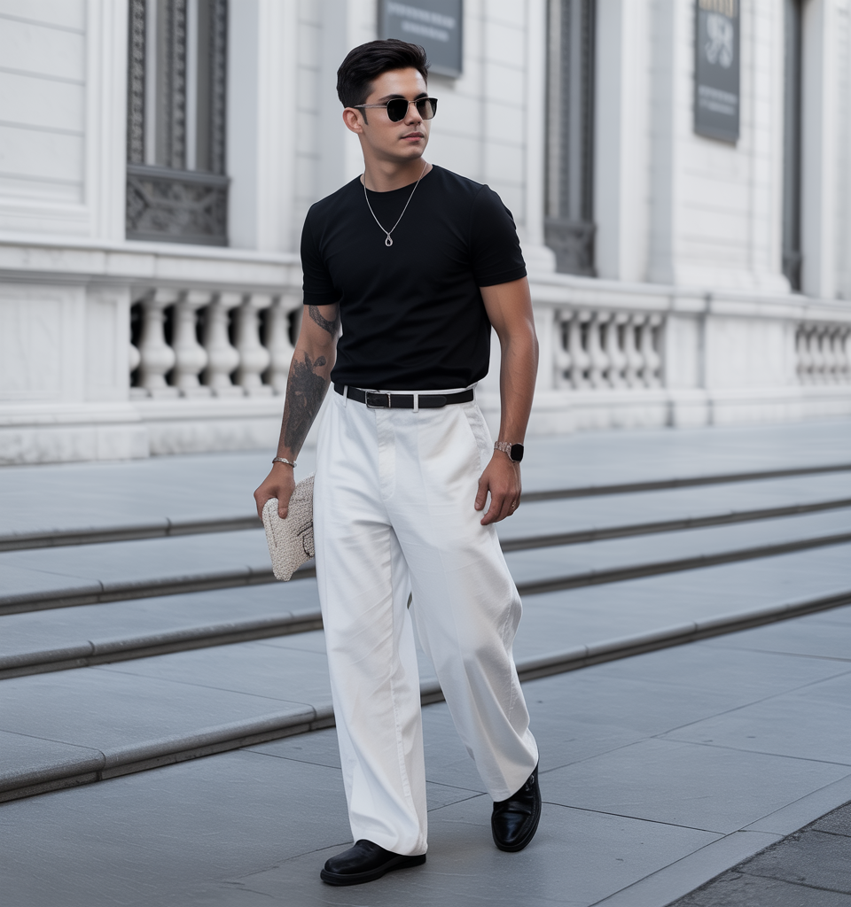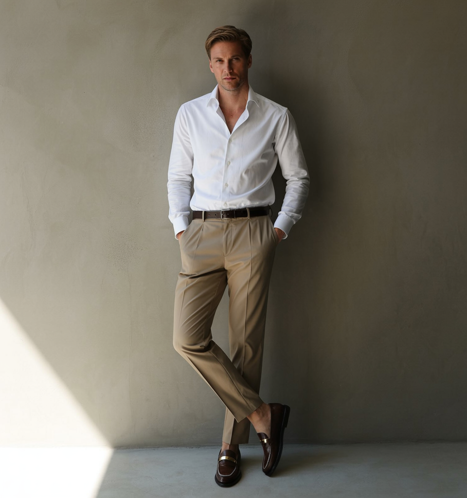 White is timeless and perfect for hot weather. When paired with khaki, it creates a clean and breathable seasonal men combo.