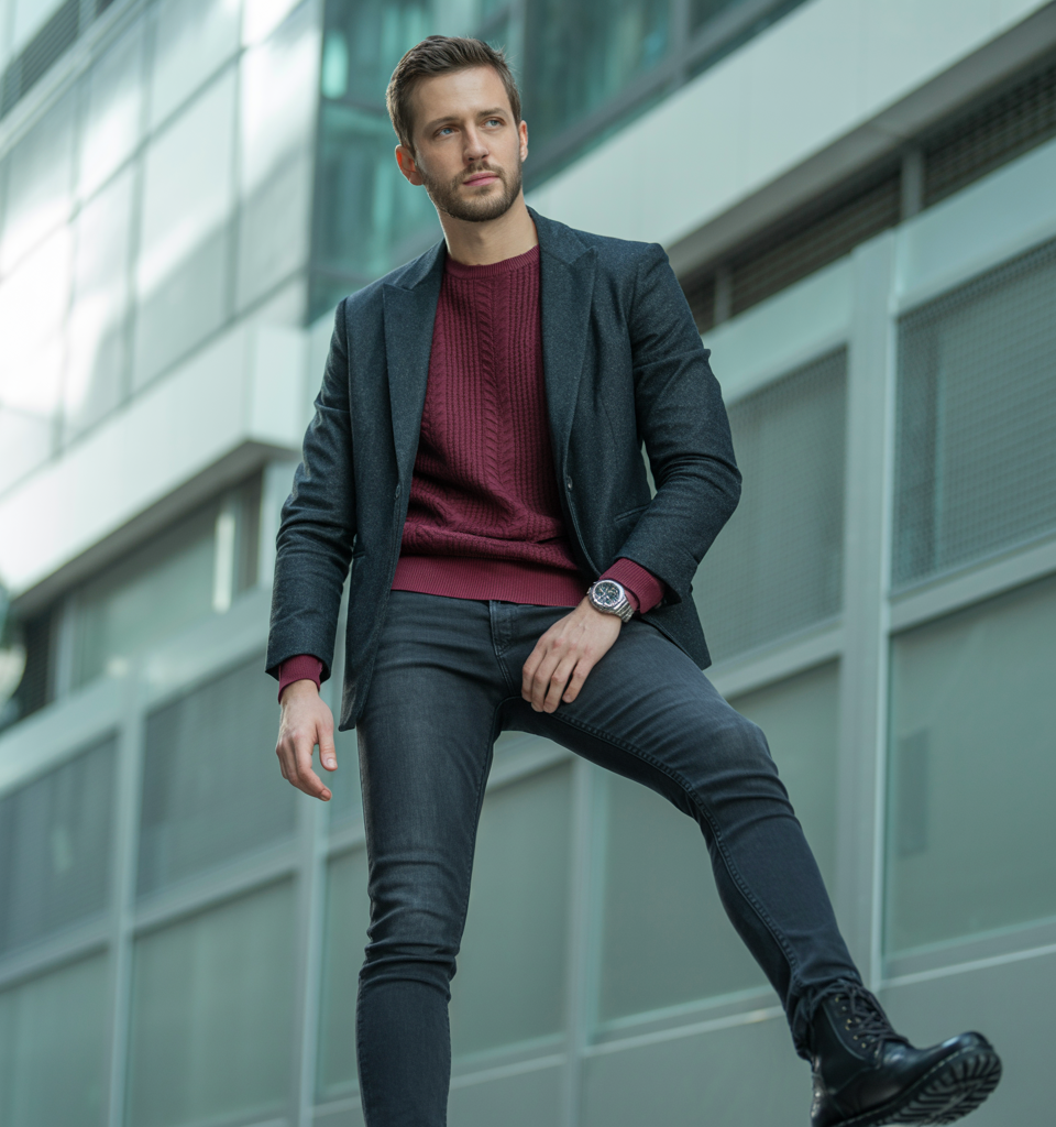 Burgundy is a winter favorite, and when paired with charcoal gray, it creates a sophisticated seasonal men combo.