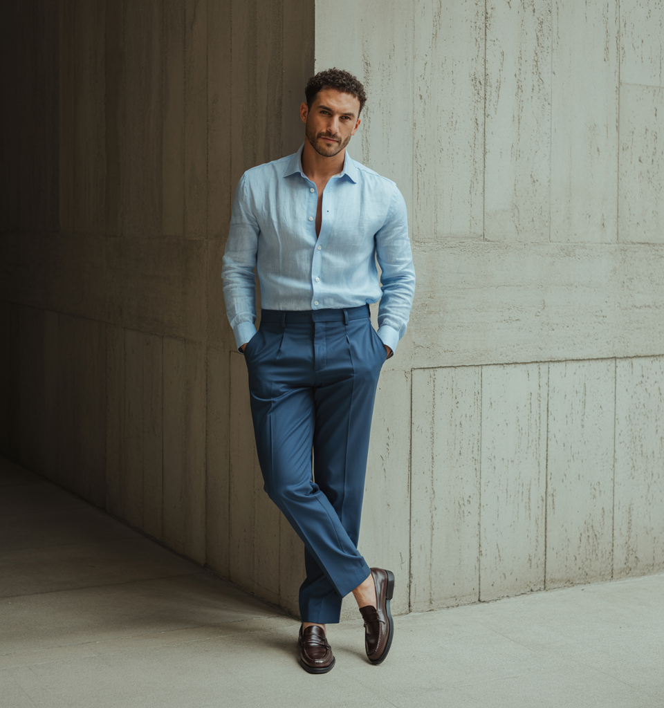 - Outfit Idea: A pastel blue button-down shirt with beige chinos and white sneakers creates a refined, modern spring look.