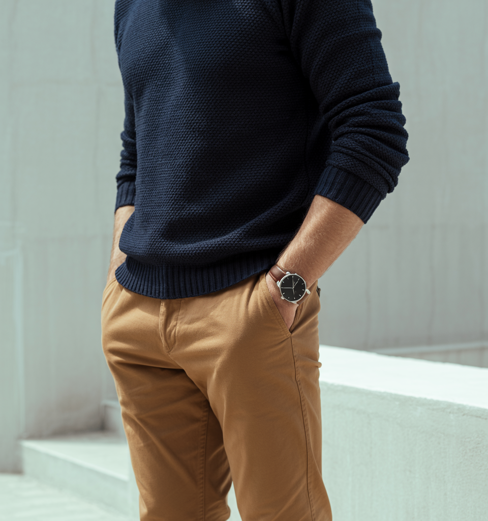Mustard yellow is a fall staple that looks great paired with navy. It creates a bold yet balanced seasonal men combination.