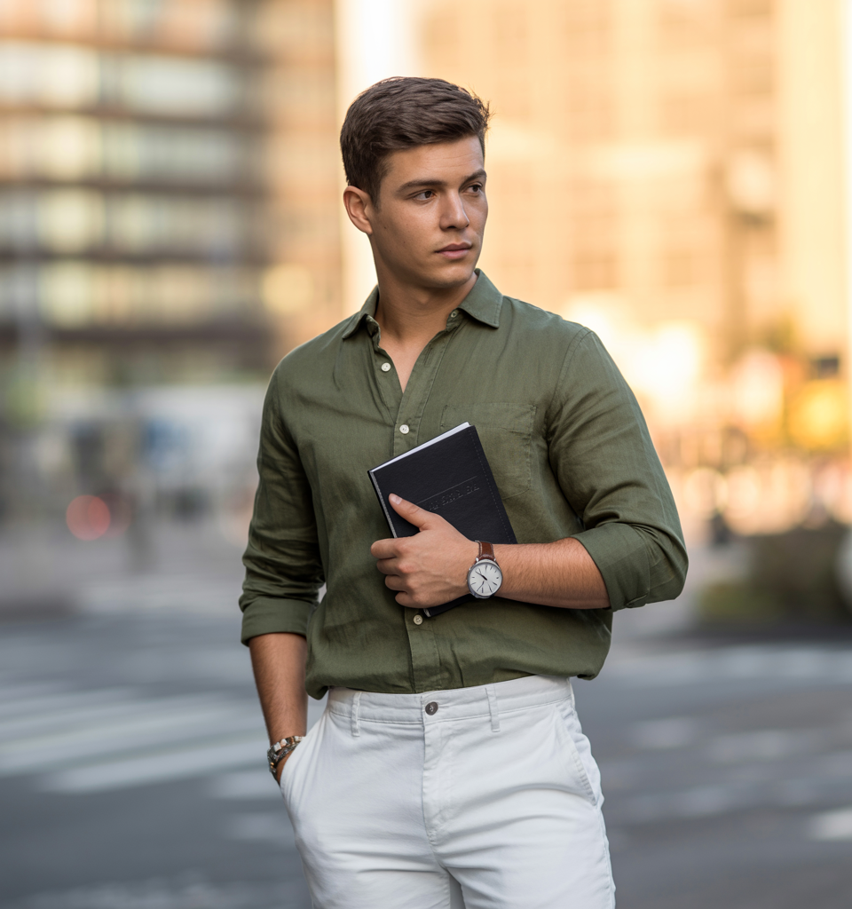 - Outfit Idea: Olive chinos with a crisp white T-shirt and sneakers create a casual yet stylish look.