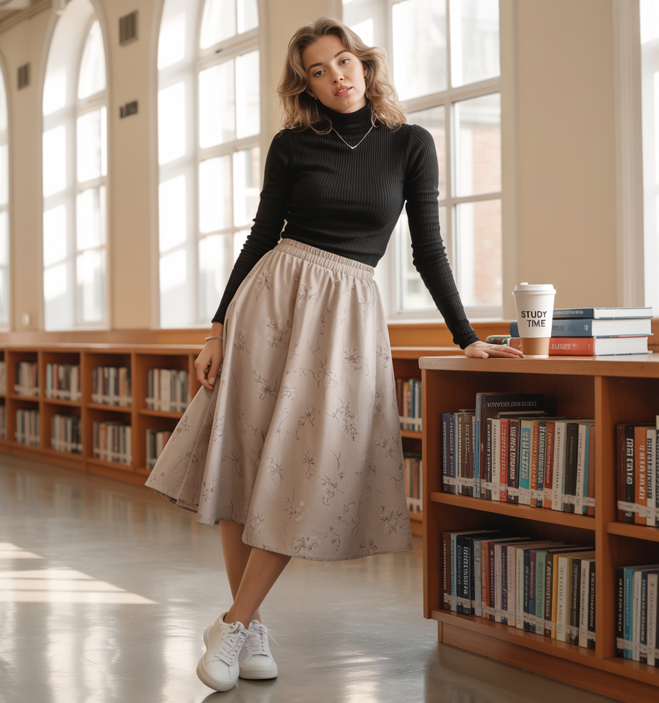 Midi skirts paired with casual tops and sneakers are a modern college outfit idea for women. It’s comfortable for all-day wear and adds a little edge to your everyday look.